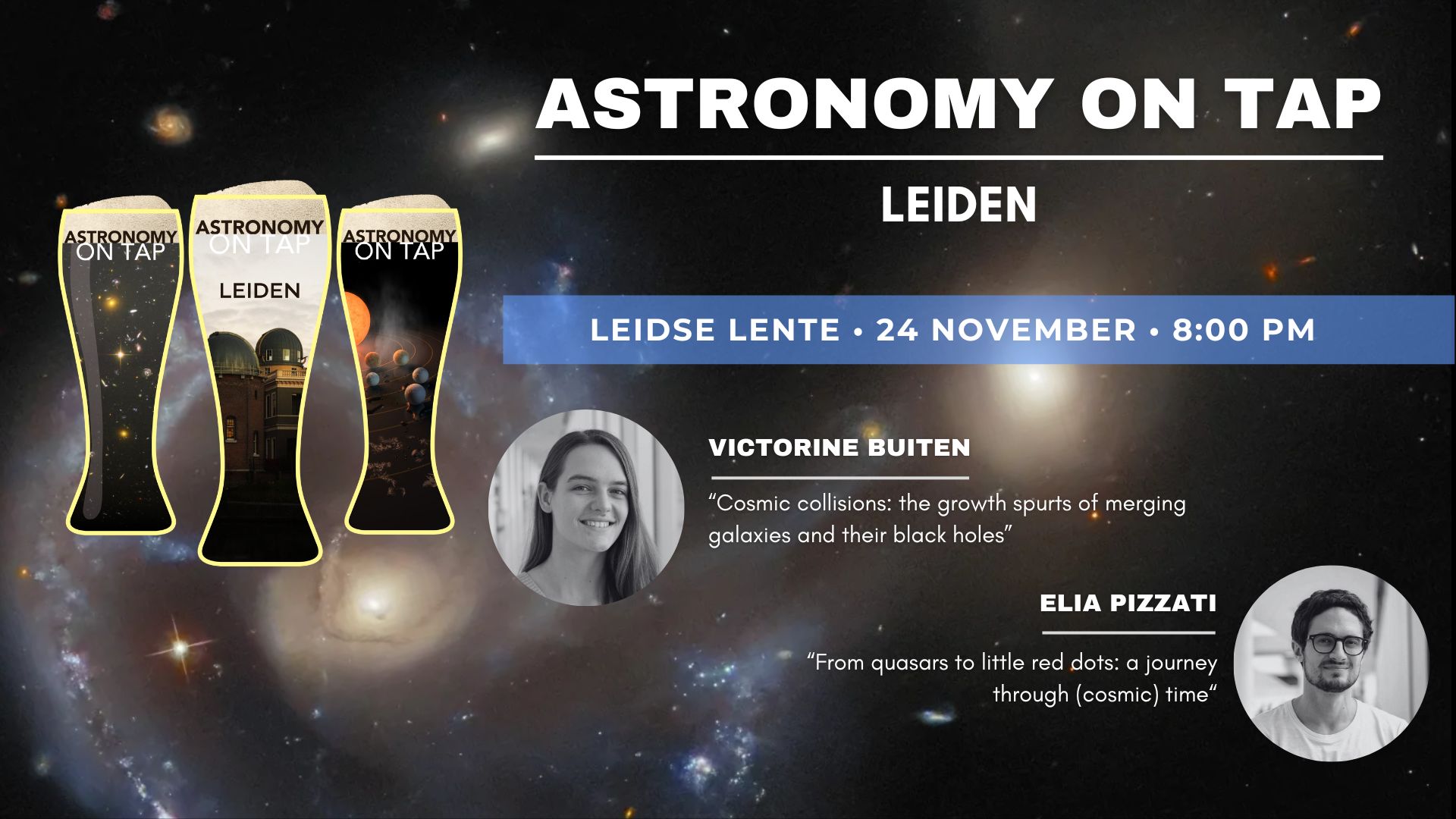 The next Astronomy on Tap Leiden (AoT) will take place on Monday 24 November at the Galerie Café Leidse Lente at 20:00 CET. Victorine Buiten will talk about collisions between galaxies, and Elia Pizzati will tell us about quasars, the furthest black holes that shine like cosmic beacons. As always, there will be fun games with which you can test your knowledge and try to win cool science prizes!