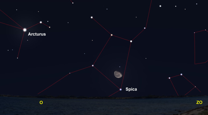 De wassende maan wordt vannacht omringd door de heldere sterren van de Winterzeshoek: Capella in het sterrenbeeld Voerman, Castor (en Pollux) in de Tweelingen, Procyon (Kleine Hond), Sirius (Grote Hond), Rigel (Orion) en Aldebaran (Stier). Naast deze sterren zijn ook de oranjerode ster Betelgeuze (ook in Orion) en de rode planeet Mars heel opvallend. Kijk rond 21.30 uur, hoog boven de zuidzuidoostelijke horizon.