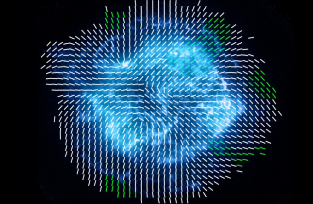 De magneetvelden van Cassiopeia A. De witte en groene streepjes zijn magneetvelden gemeten met de IXPE-telescoop. De onderliggende blauwe afbeelding is gemaakt met de Chandra-telescoop. Bij de groene streepjes is het signaal het sterkst, het meest betrouwbaar. Een groot deel van het magneetveld in Cas A heeft, tegen de verwachting in, geen sterke voorkeursrichting. Het magneetveld is grotendeels chaotisch. (c) NASA/Vink et al. [groot formaat]
