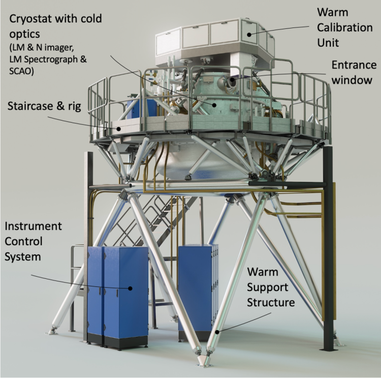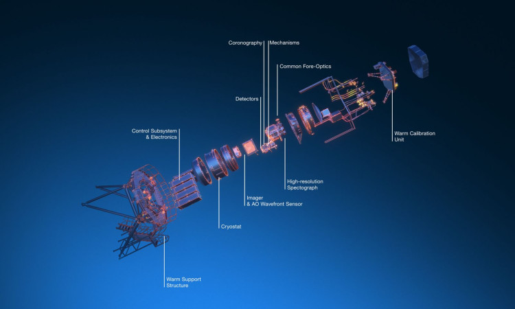 De verschillende onderdelen van het meetinstrument METIS op de Extremely Large Telescope. Credit: METIS-consortium