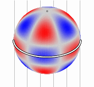 Een schematische weergave van niet-radiale trillingen op een steroppervlak. De rode delen bewegen neerwaarts, terwijl de blauwe delen tegelijkertijd opwaarts bewegen. De zwarte punt geeft de rotatie as van de ster weer en de dikke witte lijn de equator. C